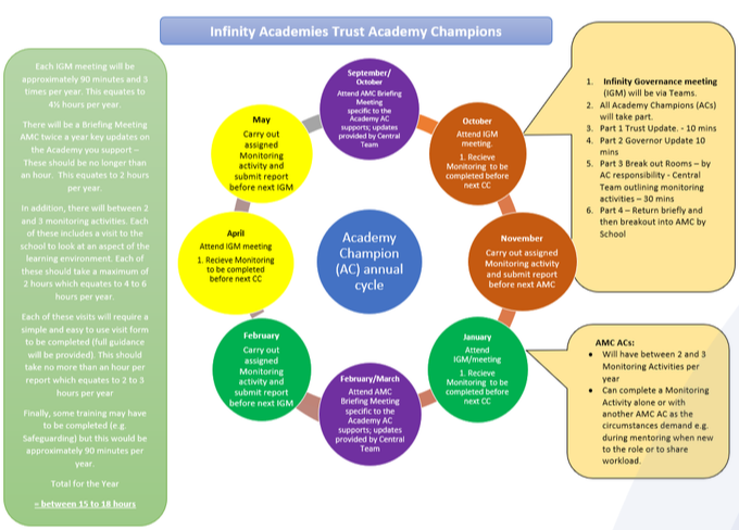 All Academy Champions have a role in monitoring and reporting on key aspects of the academy’s work as developed alongside the Central Team. In addition to this, they are encouraged to complete informal visits to their academy, support and promote the academy's activity in the community and make suggestions to further improve the Governance model.
