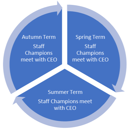 Feedback from staff is crucial in the development of our academies and the Trust. To this end, Infinity work closely with Staff Champions from each academy. Staff Champions meet as a group with the CEO at three points during the year. They have the opportunity to reflect on key areas including: